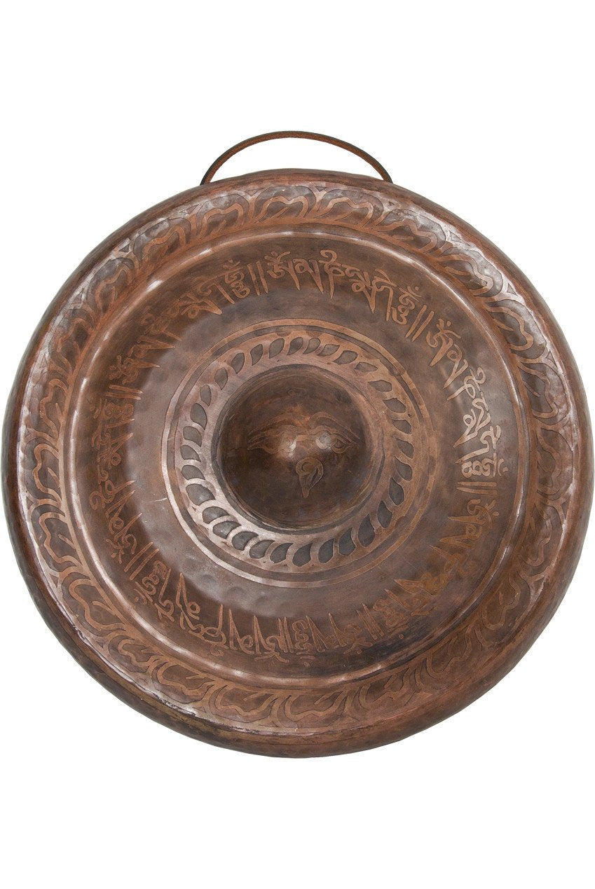 Tibetan Prayer Gong, 11 inch (27.9 cm), with Beater (Item Code WTPC11) This gong has a rich full sound, with great resonance and sustain. The entire face is embossed with Auspicious Buddhist Symbols. There are several designs and you may get a one of a kind. Whatever the design you will love the antiqued finish and the great sound. 11 diameter x 1.4 inch deep (279.4 x 35.5 mm)