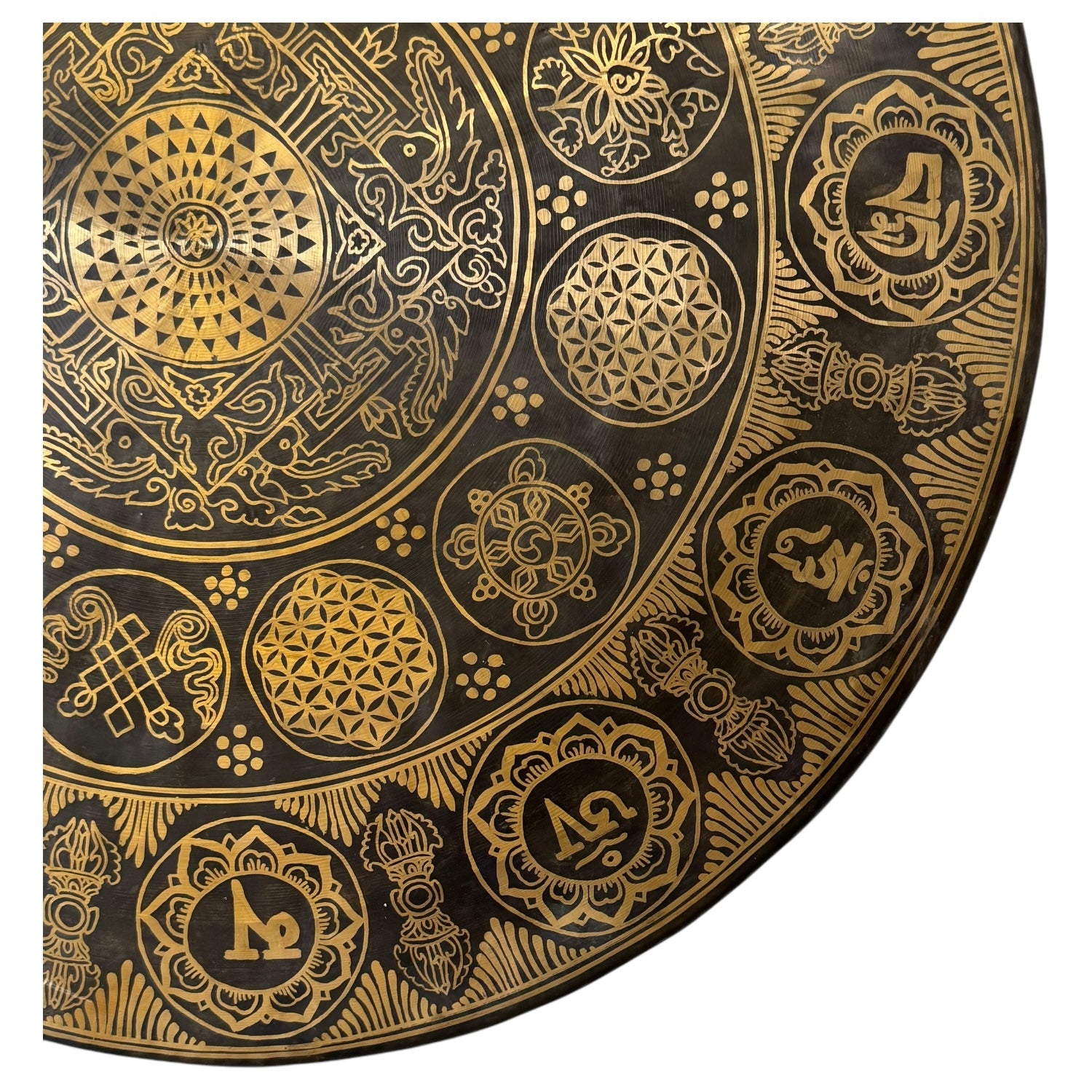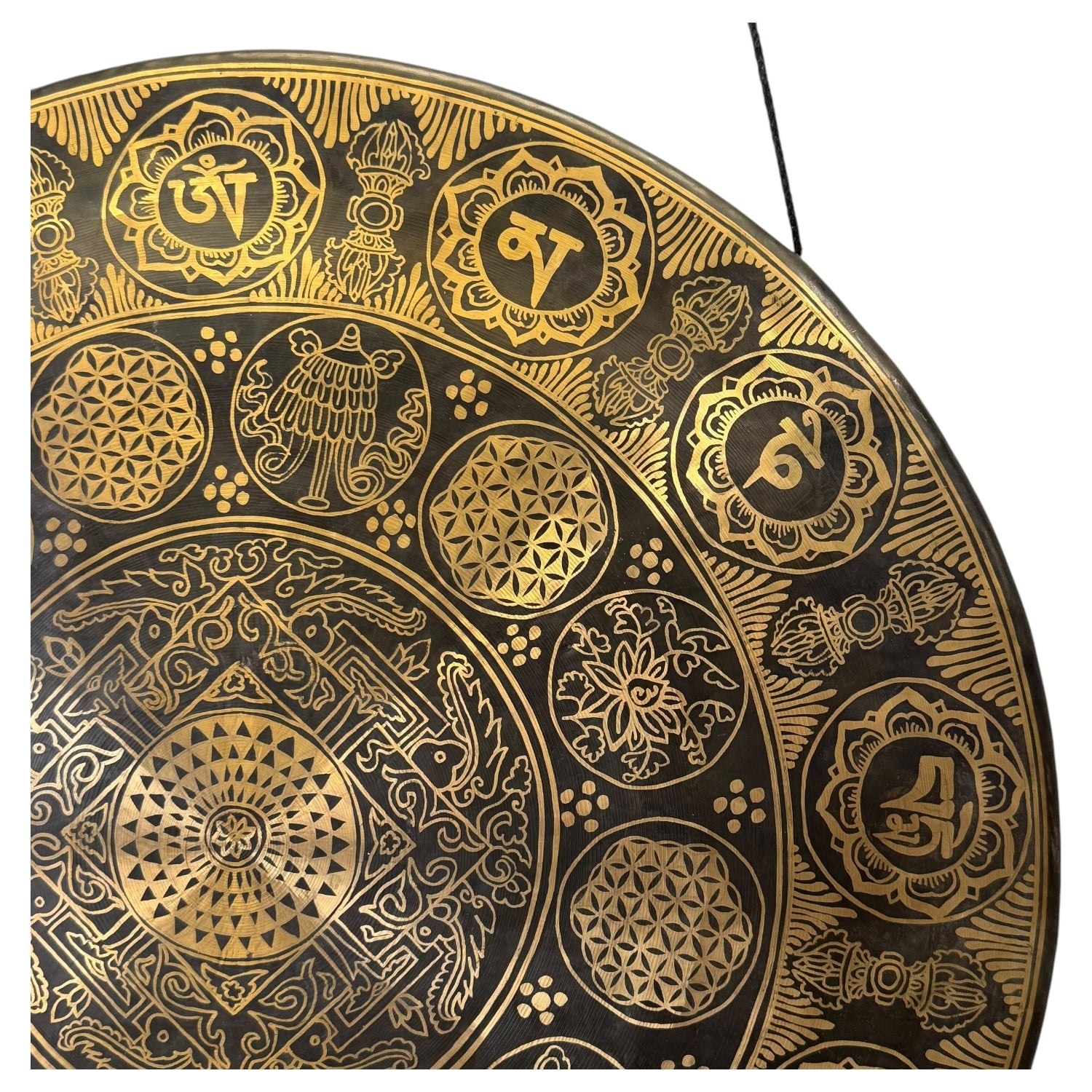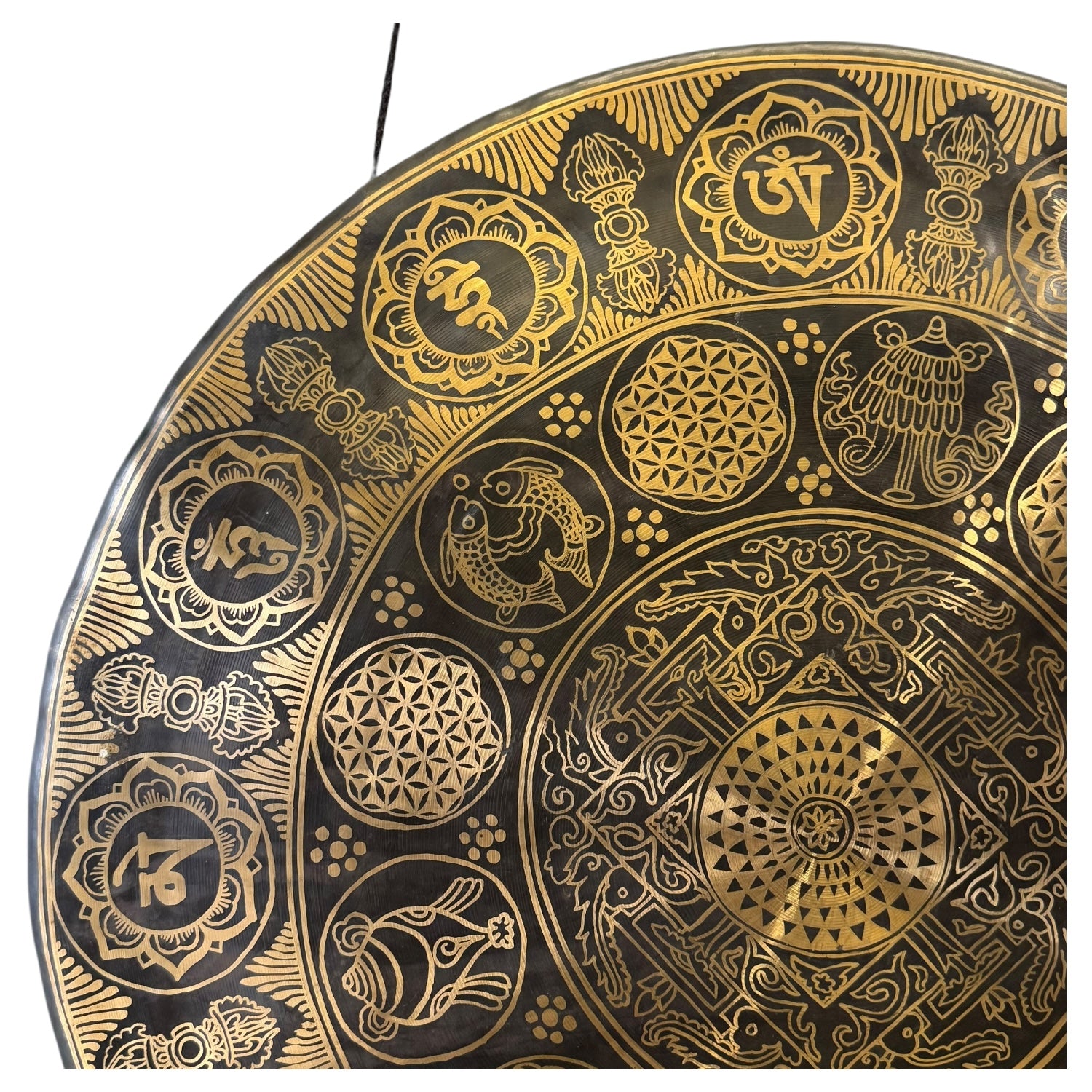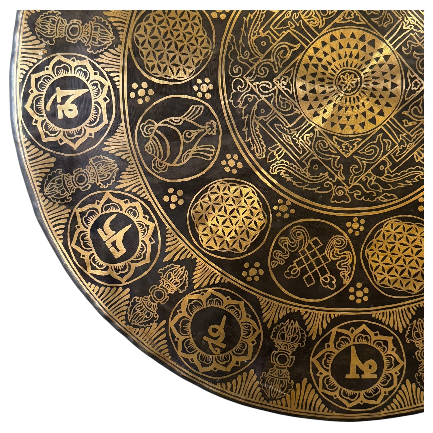 This gong features the traditional Newari art of Bajra carving. Intricate designs including the Om Mane Padme Hum mantra along with Flower of Life sacred geometry.