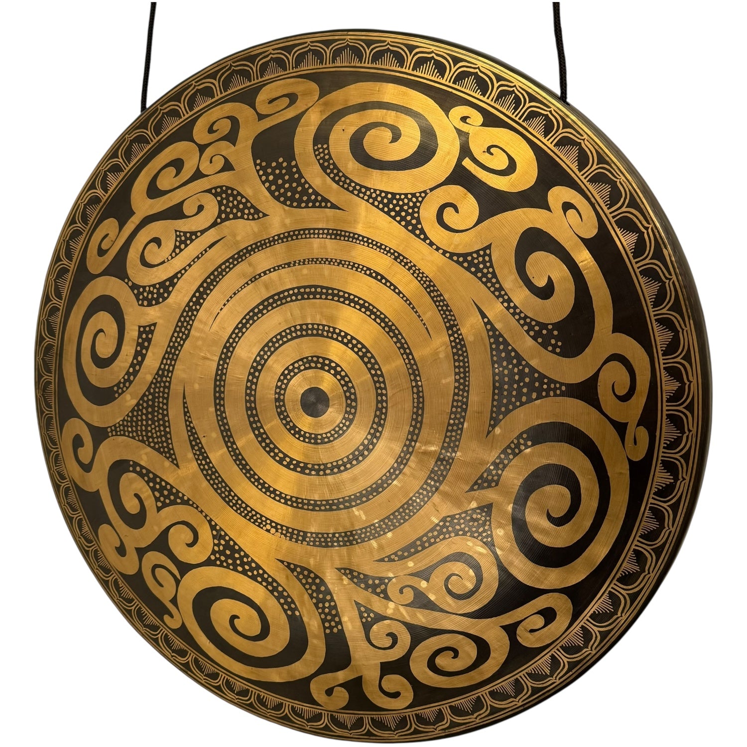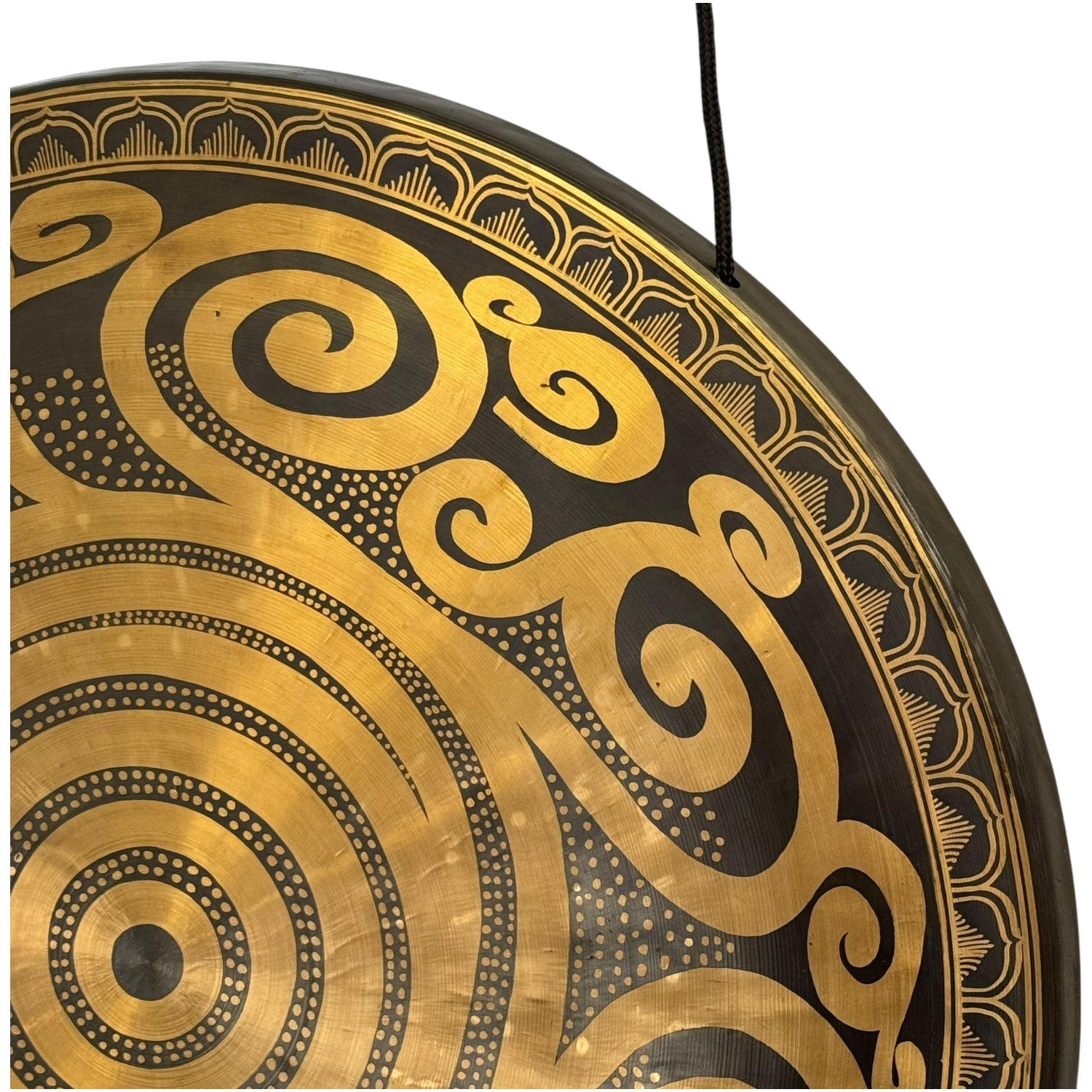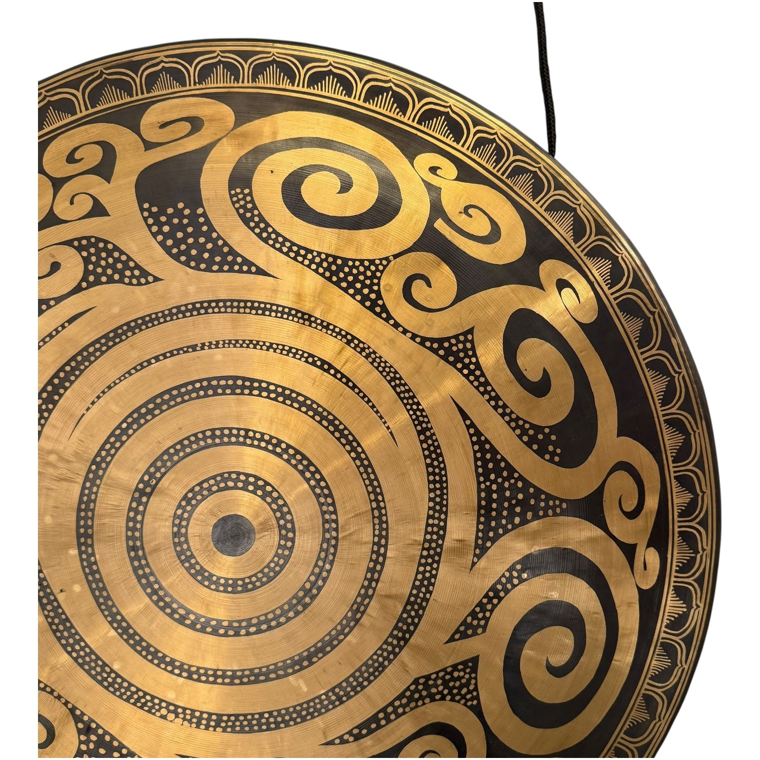 Crafted from high-quality B20 bronze, this gong is a true work of art. A dark patina is first applied, then adorned with hand-painted designs by Thangka and Mithila artists before the final artwork is carefully etched or engraved into the surface.